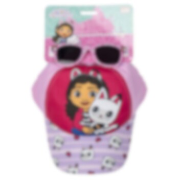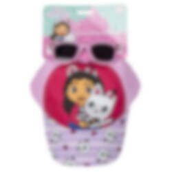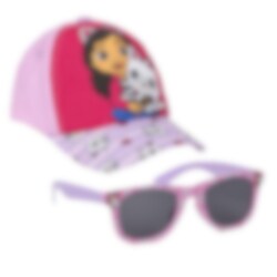 Et komplet sæt med både en smuk lyserød kasket og et par premium solbriller, begge i børnestørrelse. På brillerne er der motiver fra Gabby's Dollhouse.