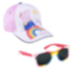 Et komplet sæt med både en sød lyserød kasket og et par premium solbriller, begge i børnestørrelser.