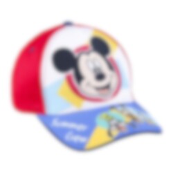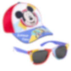 Et komplet sæt med både en sej blå og rød farvet kasket og et par premium solbriller, begge i børnestørrelse. På brillene er der motiver af de populære Disney-karaktererne Mickey Mouse og Anders And.
