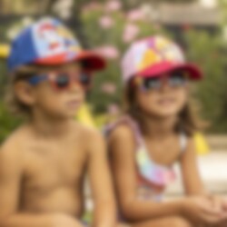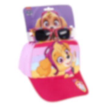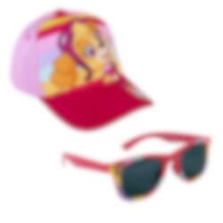 Et komplet sæt med både en sød pink og rød kasket og et par premium solbriller, begge i børnestørrelser. På brillerne er der motiver af den søde hvalpen Skye fra Paw Patrol.