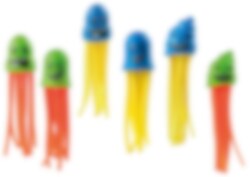 Kast blæksprutterne i poolen og se hvor hurtigt du kan fange dem. Blæksprutterne gør det endnu sjovere, når du skal træne på at blive bedre til at svømme og dykke. De er meget farverige og er også gode som badelegetøj i badekarret for de mindste børn. Længde 12 cm.