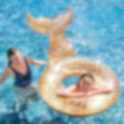 Virkelig eksklusiv og luksuriøs havfrue-badering i guld med masser af glimmer. Du vil blive den allersejeste på stranden eller ved poolen med denne badering. Den oppustelige glimmerhavfrue er 147 x 107 x 79 cm.