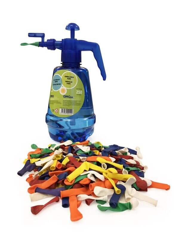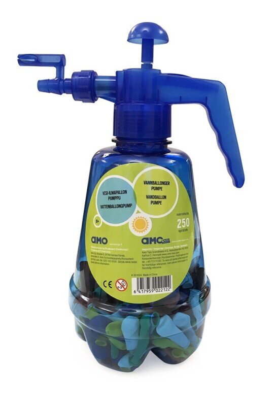 Vandballoner med medfølgende pumpeflaske til at nemt at ballonerne med vand. I alt 250 balloner er inkluderet og flasken.