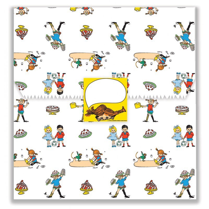 8 stk. slikposer af papir samt 8 stk. navneskilte med et sejt motiv af Pippi Langstrømpe. Fyld poserne med slik og spændende overraskelser og giv dem ud til dine venner under festen.