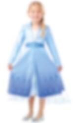 Frost 2 - Elsa børnekostume Premium Edition inkluderer en lyseblå kjole med smarte og glitrende detaljer samt en glitrende frakke, en nederdel med dobbelt lag, der har funklende sømdetaljer og ægte sten hele vejen rundt og et broderet bælte med ægte sten. Sko og paryk medfølger ikke. Parykken sælges separat. Dragten er lavet af 100% polyester og fås i tre størrelser, der passer til børn mellem 3 år og 8 år. Leveres i en hængende tøjpose af plast med ophængningsanordning til nem opbevaring i skabet. Dette er et officielt licenseret Disney-produkt.