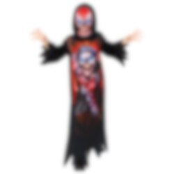 Gaming Reaper kostume indeholder en sort frakke med matchende hætte og en fuld maske, der forestiller en uhyggelig lejeskærmand. Kostumet er lavet af 100% polyester og fås i en størrelse, der passer til børn i alderen 8 til 10 år. Bør vaskes i hånden og tørres i tørretumbler. Størrelsen på kostumet er 134-146 cm.