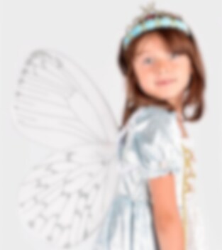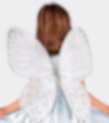Lad som om du flyder væk med disse drømmende vinger. Vingerne har flotte detaljer i sølvglitter. Nem at tage af og på med skulderstropperne i satinbeklædt elastik. Hver vinge er ca 55 x 22 cm.