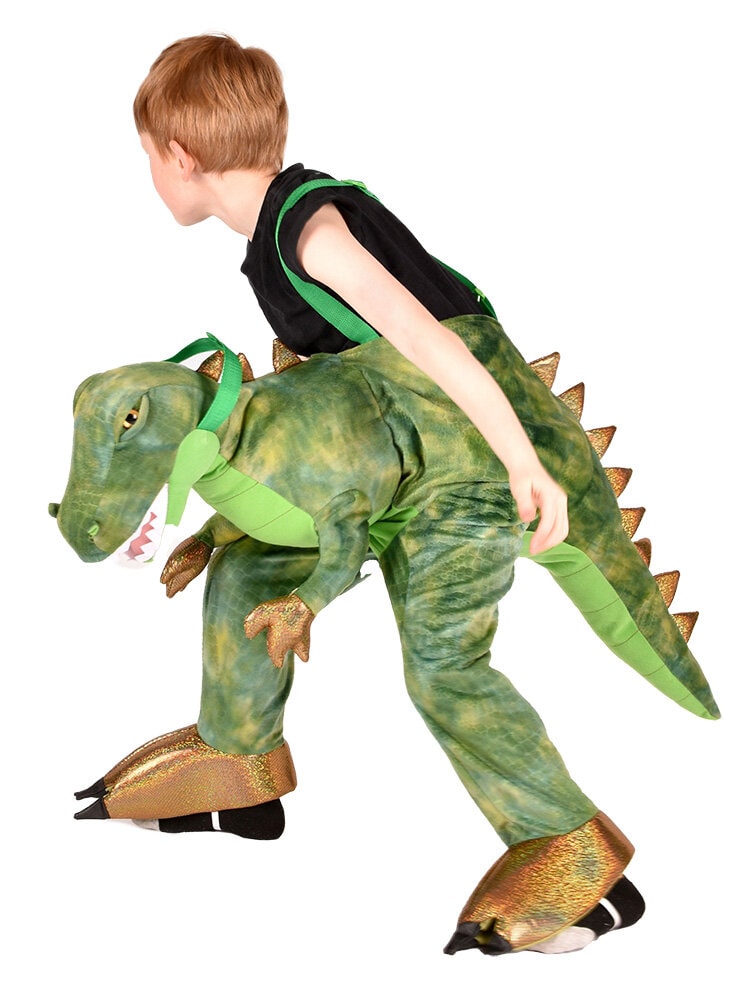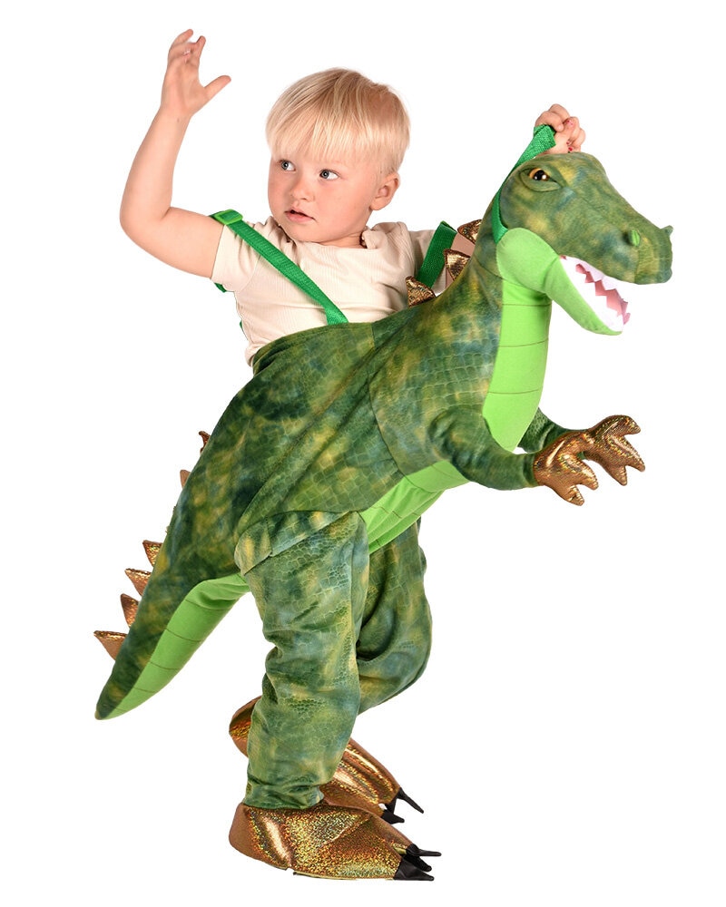 Det grønne Dinosaur Jump-in Kostume indeholder et kostume, der giver illusionen af at ride på en skræmmende dinosaur. Kostumet er lavet af 100% polyester og fås i en størrelse, der passer til børn fra 3 år til 8 år. Størrelsen på kostumet er 90 x 90 cm, skal vaskes i hånden og tørres dryppende.r