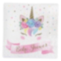 16 stk. servietter med en hvid baggrund og med motiver af en enhjørning og stjerner i farverige farver samt teksten "Baby Shower" og med guldfarve på begge sider. Et passende tilbehør at have på bordet til enhjørningsfesten. Servietterne er 2-lags og er ca. 33 x 33 cm store udfoldede.